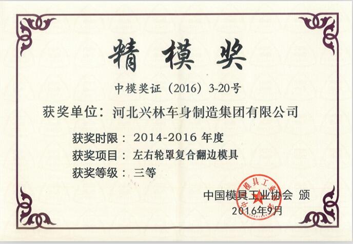 我公司于2016年6月28日至7月1日參加在上海新國(guó)際博覽中心舉行的第十六屆中國(guó)國(guó)際模具技術(shù)和設(shè)備展覽會(huì),展會(huì)期間,中國(guó)模具工業(yè)協(xié)會(huì)繼續(xù)開展了兩年一度的“精模獎(jiǎng)”評(píng)選活動(dòng),我公司憑借“左右輪罩復(fù)合翻遍模具”榮獲2014年~2016年度“精模獎(jiǎng)”三等獎(jiǎng)。