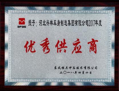 2018年4月10日在東風(fēng)模具沖壓技術(shù)有限公司2018年供應(yīng)商大會(huì)上,河北興林車身制造集團(tuán)有限公司憑借產(chǎn)品質(zhì)量過硬、交貨迅速及時(shí)、服務(wù)細(xì)致周到,被東風(fēng)模具沖壓技術(shù)有限公司授予2017年度“優(yōu)秀供應(yīng)商”榮譽(yù)稱號(hào)。